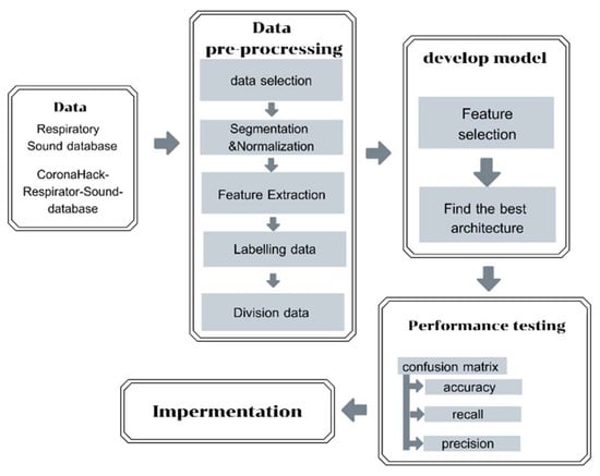 The third step involves embedding a machine learning (ML) model into a cloud-based system. Once the auscultation sounds are transmitted from the smart stethoscope and sent to the cloud-based system, it will analyze the data using a pre-trained ML model developed in Python. This model can classify the sounds into one of four categories: healthy, COPD, pneumonia, or other respiratory diseases. The ML model provides a probabilistic diagnosis based on the sound patterns it detects, and the results are displayed on a mobile application in real time. This approach allows for quick and accurate screening, aiding in early detection and timely intervention, even in out-of-hospital settings. Figure 2 represents the process of developing and evaluating the model’s performance, which includes data collection, data pre-processing, development and evaluation of the model, performance testing, and model implementation. More details on the five-step development process are provided below.