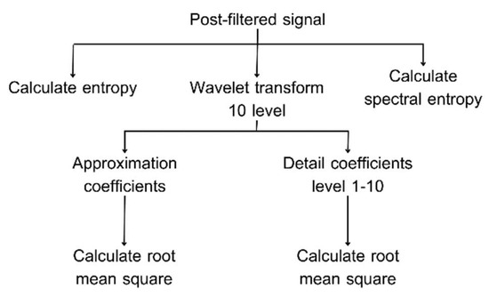 From the literature review, the optimal sound length for analyzing respiratory sounds is 6 s. Due to a mother wavelet, which is a mathematical function of a small wave current that represents translated and scaled copied of a finite-length waveform, the optimal mother wavelet is a Daubechies wavelet (db7) [39]. Using the statistical data, a 10th-level wavelet-transformed signal was found to improve the model’s efficiency [32]. Additionally, the entropy feature can boost the model’s accuracy up to 90% [27]. Therefore, we are interested in the entropy feature (Shannon entropy and spectral entropy) and statistical data (root mean square) of the frequency component coefficient from the discrete wavelet transform signal. In this study, we normalize the measured signals to simplify them and ensure that the values fall within the range of [−1, 1]. Then, using the fixed-length segment method, the measured signals are segmented into 6-s intervals, covering the duration of a breathing cycle. Therefore, wavelet transformation using the Daubechies wavelets (db7) of order 10 was applied to selected data. Finally, the measured signals undergo feature extraction using Shannon entropy and spectral entropy, and statistical data undergo feature extraction with the root mean square (RMS) of the frequency component coefficient from the discrete wavelet transform signal. For the spectral entropy method, this is calculated by analyzing the signal to determine its energy in the frequency domain. We compute the probability distribution of energy across each frequency band using the energy data. For the Shannon entropy method, this is calculated by using log2; this method calculates entropy over the entire signal segment, specifically within a 6-s duration.