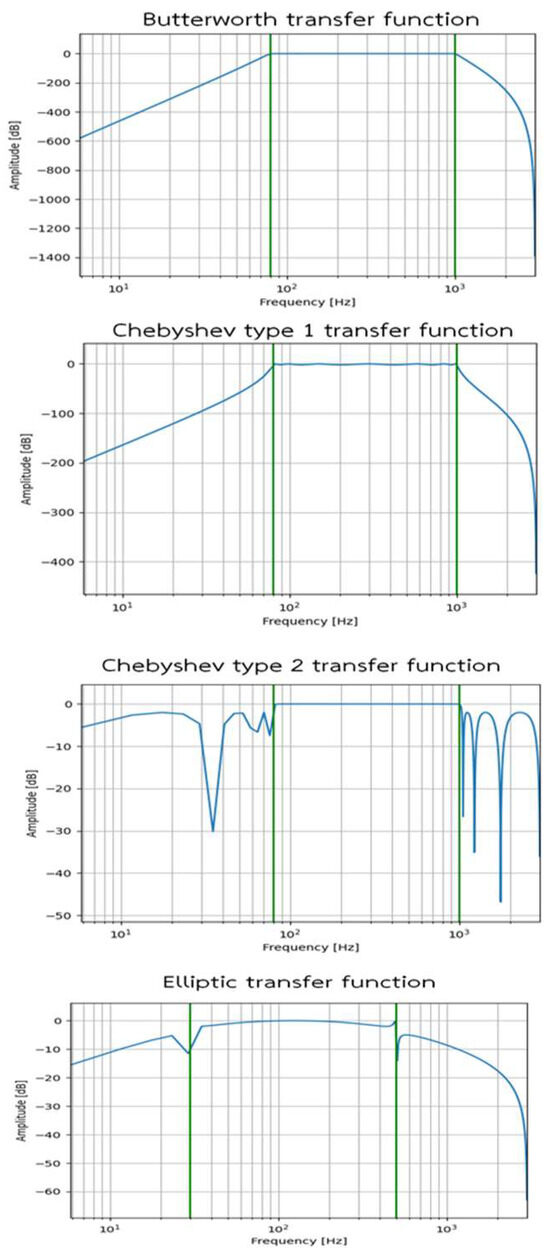 The results of the frequency response of these filters are shown in Figure 6. The frequency response results show that the Butterworth transfer function has a stable frequency response and offers a significant difference in this bandpass. Moreover, other transfer functions showed unstable frequency responses. Therefore, it was concluded that the Butterworth filter was superior to the others, and so it was selected and employed in the system.