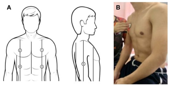 (A): Recording respiratory sounds at the measured position 1–5; (B) example of acquiring a male volunteer’s respiratory sound.