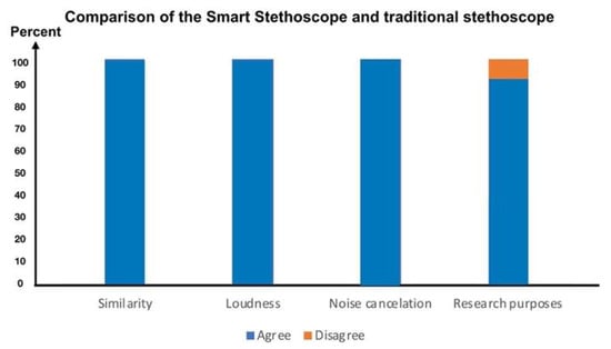 As shown in Figure 9, the results revealed that all participants reported that the smart stethoscope provided sound quality comparable to the traditional acoustic stethoscope, ensuring no compromise in diagnostic accuracy (N = 20, 100%). Also, it offered similar or better loudness compared to the traditional acoustic stethoscope (N = 20, 100%), delivering clear sounds even in environments with significant background noise. The noise cancellation feature was either equal or superior (N = 20, 100%), effectively minimizing environmental disturbances and enhancing the clarity of auscultation, which could be particularly beneficial in busy hospital settings. Furthermore, the smart stethoscope demonstrated a significant advantage in supporting research applications (N = 19, 95%), with features such as digital sound recording, data storage, sharing capabilities, and potential integration with telemedicine platforms. These findings suggest that the smart stethoscope could be a valuable tool for both clinical practice and medical research.