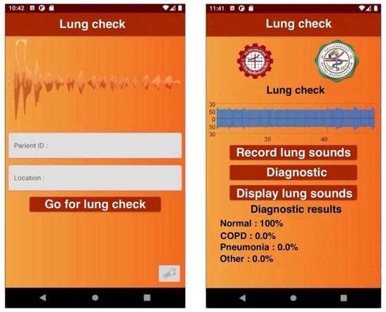 The mobile application acts as an intermediary, transmitting data from the sound acquisition device for processing on the server and displaying the server’s results, as shown in Figure 10. It consists of two pages: a home page and a display page. The home page is the default page, where the patient’s ID and measurement location are entered. The display page shows the raw respiratory signal and the likelihood of the patient being healthy or having a respiratory disorder. In the experiment, pressing the record button starts recording the respiratory sound. Pressing the record button a second time stops the recording. The analysis button is then pressed to send the data to the server and retrieve the result, which is displayed on the application screen.