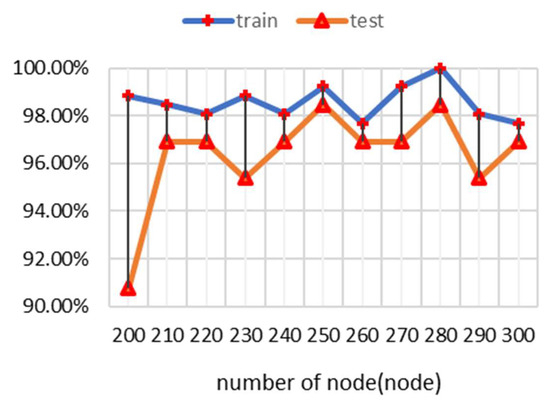 To find the best model for evaluating respiratory conditions, we tested the different node inputs that can offer the best performance to differentiate each respiratory condition using different numbers of nodes in the hidden layer. Using selected features from the feature selection process, selected numbers of hidden layer nodes ranging from 200 to 1000 nodes were applied to test the accuracy of the training and testing data, as shown in Figure 11. The result revealed that the model with a hidden layer of 250 nodes achieves the best test accuracy of 98% and provides the highest accuracy, with a 1% difference between training and testing accuracy. Therefore, 250 nodes is considered the optimal number of nodes.
