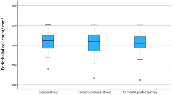 A smaller population was studied by Steindor et al., who included 14 eyes from 12 patients. They also demonstrated no significant endothelial cell loss (preoperative ECD: 2074 ± 706.6 cells/mm2; postoperative: 2029 ± 742.3 cells/mm2; p = 0.42) [15]. With a similar average age of 68 ± 9.8 years, their patient population was comparable to that of our study. The minimum follow-up period was 12 months, with an average of 20 ± 2.7 months. Our study design included a planned follow-up period of 3 and 12 months, with an average follow-up duration of 13.66 months (median: 13.64 months) at the 12-month timepoint, ensuring a more stable follow-up and contributing to the validity of the data.