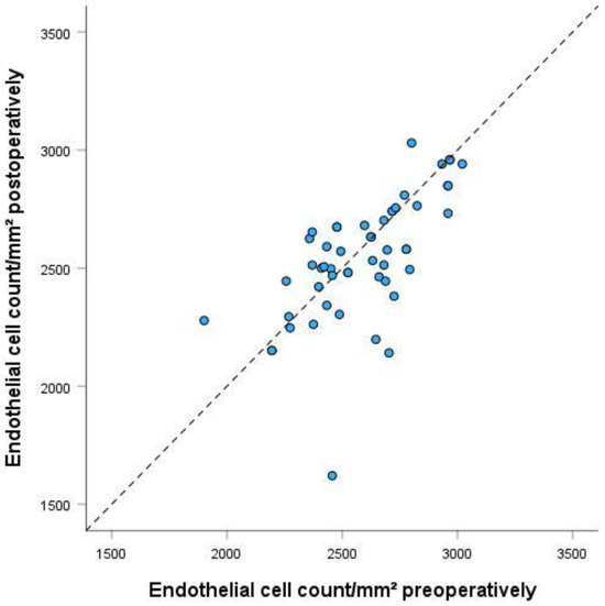 Endothelial cell count preoperatively and 12 months after Preserflo implantation. p = 0.229. The scatter plot shows the endothelial cell counts pre- and postoperatively per mm2. ° represent outliers.