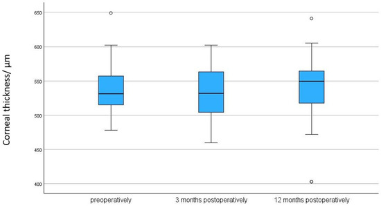 Corneal thickness preoperatively, after 3, and after 12 months following Preserflo implantation. p = 0.118. The box plot diagram shows the median, 25th and 75th percentiles, and the minimum and maximum values (whiskers). µm = micrometers, CT = corneal thickness. ° represent outliers.
