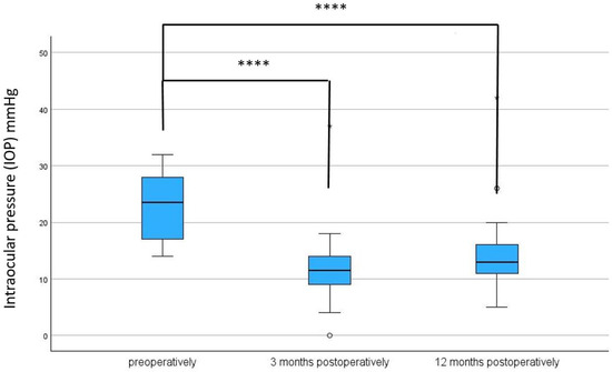 After a 3-month and a 12-month follow-up period, a significant reduction in IOP was observed, from a preoperative median of 23.5 (IQR: 17;28) mmHg to a postoperative median of 11.50 (IQR: 5.6;14) mmHg (p < 0.001) at 3 months and 13.00 (IQR: 5.9;16) mmHg (p < 0.001) at 12 months (see Table 2 and Table 3, and Figure 4).