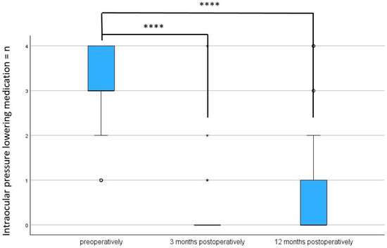 Reduction in IOP-lowering medications preoperatively, after 3, and after 12 months postoperation. **** = p < 0.001. The box plot diagram shows the median, 25th and 75th percentiles, and the minimum and maximum values (whiskers). n = number, IOP = intraocular pressure. ° and * represent outliers.