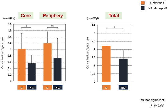 Concentrations of glutamate (Glu) in the tumor core and periphery of glioblastoma (GBM) samples with perioperative epilepsy (Group E) and without epilepsy (Group NE). Extracellular concentration of Glu was significantly larger in Group E, both in the tumor core and for total tumor tissue, than Group NE. In the tumor periphery, the Glu concentration in Group E tended to be larger compared to Group NE. ns, not significant; * p < 0.05; E, Group E; NE, Group NE.