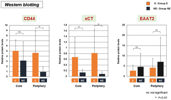 Western blotting analysis comparing expressions of cluster of differentiation 44 (CD44), xCT, and excitatory amino acid transporter 2 (EAAT2) between Group E and NE in the tumor core and periphery. Group E showed higher expression of CD44 in the periphery and higher xCT in both the core and periphery of the tumor. No significant difference was seen for EAAT2. ns, not significant; * p < 0.05; E, Group E; NE, Group NE.