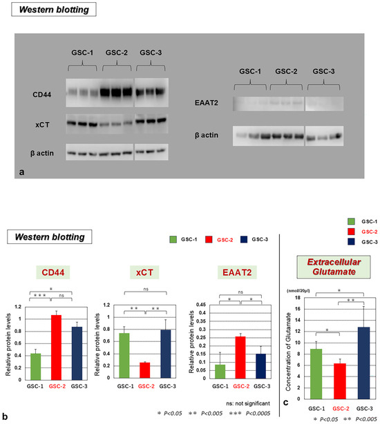 (a) Western blotting analysis of CD44, xCT, and EAAT2 expression showing on the gel. (b) Expressions of CD44, xCT, and EAAT2 and (c) extracellular Glu concentration in three glioma stem-like cell (GSC) lines, GSC-1, -2, and -3. GSC-2 showed the highest CD44 expression while displaying the lowest xCT and extracellular Glu concentration and the highest EAAT2. The pattern of extracellular Glu concentration coincided with that of xCT. Protein levels were normalized as ratios versus β-actin and indicated as “Relative protein levels”. ns, not significant; * p < 0.05; ** p < 0.005; *** p < 0.0005.