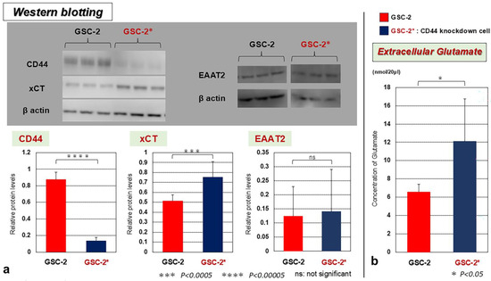 To elucidate the functional roles of these molecules in GBM epileptogenesis, we performed an in vitro study using human GSC lines. The GSC lines showed different patterns of expression for CD44, xCT, and EAAT2. The results demonstrated that extracellular concentrations of Glu coincided with the expression pattern of xCT, whereas CD44 and EAAT2 displayed an inverse pattern. Following this, to examine the relationship among these three molecules, we obtained GSC-2* by knock down of the CD44 gene on GSC-2 with shRNA, which presented the highest expression of CD44. GSC-2* showed significantly increased expressions of xCT along with elevated extracellular Glu compared to GSC-2. These results suggest that CD44 and xCT may be reciprocally expressed. As EAAT2 functions to restore Glu within cells, increased levels may participate in lowering extracellular concentrations of Glu. However, considering the small amount of EAAT2 expression by GSCs, effects on the extracellular concentration of Glu may not have been significant compared to those of xCT.