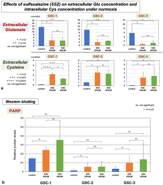 Inhibition of xCT by SSZ decreased extracellular Glu release and increased extracellular cysteine concentration in all GSCs (Figure 5a). In addition, treatment of GSCs with SSZ promoted the cleaved PARP under 5% O2 hypoxic conditions, demonstrating the induction of apoptosis by SSZ in all GSCs (Figure 5b) (Supplementary Figure S2).