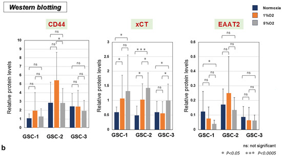 (a) Extracellular Glu concentrations in the three GSC lines and GSC-2* under differential hypoxia of 1% and 5% O2. All GSCs showed a tendency toward an increase in Glu concentration by changing the hypoxia from 1% to 5% O2. In particular, GSC-2 was the only cell line to demonstrate a significant increase in Glu. (b) Effects of hypoxia (1% and 5% O2) on expressions of CD44, xCT, and EAAT2 in the three GSC lines. A tendency toward severe hypoxia increasing CD44 and EAAT2 expression and decreasing xCT expression was seen in all GSC lines compared to moderate hypoxia. Changes of CD44 and xCT expression between the two hypoxias were significant only in GSC-2. ns, not significant; * p < 0.05, *** p < 0.0005.
