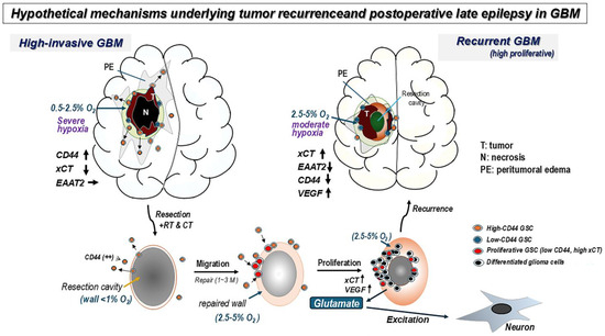 The theoretical dichotomy expressed by “migrating cells cannot proliferate” [25] may be applied to the present relationship between CD44, as a stimulator for cell migration, and xCT, as a promotor for cell proliferation. Most recurrence of GBM occurs locally around the tumor resection cavity. GSCs, which reside in the tumor border niche, migrate into the peritumoral area, and, surviving resection and radio-chemotherapy, may wait for the opportunity to cause tumor recurrence [26]. After the injured tissues of the cavity wall have been repaired, the highly migratory GSCs may return to the original site around the resection cavity guided by the gradient of oxygen tension, where the environment is of moderate hypoxia of 2.5–5%O2 [27]. In such a microenvironment of moderate hypoxia, GSCs can aggressively proliferate because this particular condition of hypoxia provides a favorable oxygen condition for proliferation of cancer stem cells [28]. Here, we display an illustration of hypothetical mechanisms that shows common cellular processes shared in developing tumor recurrence and postoperative late epilepsy in GBM under a gradient of differential hypoxia (Figure 7).