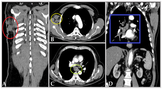 Imaging at initial presentation, i.e., details from contrast-enhanced computer tomography of thorax and abdomen, arterial phase, demonstrating malignant melanoma clinical stage at diagnosis (pT4b cN2 M1lym): (A) coronal view, primary lesion (red circle) in the right subscapular area; (B) axial view, right axillary adenopathic block (yellow circle); (C) axial view, large upper mediastinal adenopathy (green circle); (D) coronal view, right hilar and peribronchial adenopathic block (blue square).