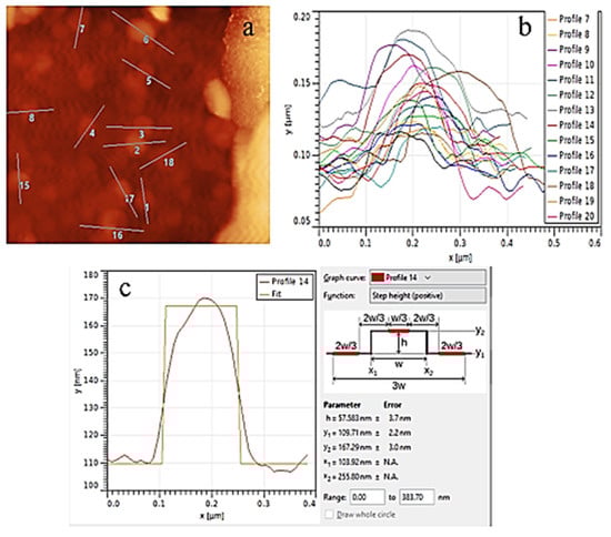 Atomic Force Microscopy (AFM) analysis of liposome morphology. (a) AFM Image of liposome slices, where the positions of the slices are marked for further analysis. (b) shows the curves corresponding to these slices, (c) illustrates an example curve used to define the height and diameter of the liposomes.