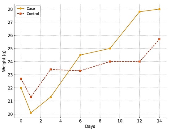 During the study, the treatment group showed an average weight gain of 6 g (22 to 28 g), while the control group gained 3 g (22.7 to 25.7 g). Both groups initially experienced weight loss within the first 24 h post-injury. However, by day 6, the treatment group’s weight gain was observed to be double that of the control group, indicating better recovery and health outcomes. The statistical analysis (p = 0.62) suggests no significant difference between the groups, but the trend indicates potential benefits of the treatment (Figure 4).