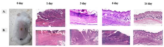 Throughout the experimental period, body weight and wound size were measured regularly to monitor overall health and treatment efficacy. Wound healing was evaluated by assessing the progression of wound closure and recovery across all groups. On experimental days 1, 3, 6, and 14, tissue samples were collected for detailed histological analysis.