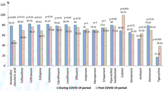 Antimicrobial resistance of Escherichia coli strains during and post-COVID-19 period.