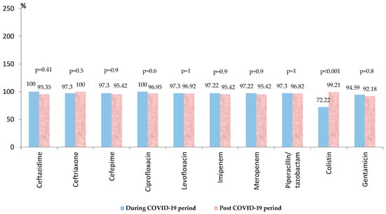 Acinetobacter spp. ranked second in frequency, representing almost a quarter of all the Gram-negative strains. Almost 80% of the isolated strains were found in the post-COVID-19 period. For the entire period, it was found that there was a very high level of resistance for the Acinetobacter strains to the third and fourth-generation cephalosporins (over 95%) (Table S4). All the tested strains were resistant to cefotaxime and aztreonam (Table S3). High resistance was found also to the carbapenems (95%), piperacillin-tazobactam (around 97%), fluoroquinolones (97%), aminoglycosides (around 90%), and colistin (over 90%) (Table S3). In the post-COVID-19 period, there was a slight decrease in resistance to most of the tested antibiotics, without statistical significance (Figure 3). There was a significant increase in the antibiotic resistance rate against colistin (from 72.22% to 99.21%, p < 0.001). Almost 90% of the strains (150/169) were MDR, 5.32% (9/169) were PDR, and 92.30% (156/169) were carbapenem-resistant.
