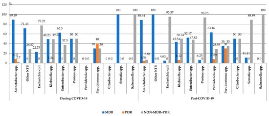 Distribution of the Gram-negative microorganisms isolated from blood samples from patients hospitalized in the ICU, County Emergency Clinical Hospital Craiova, Romania, during and post-COVID-19 periods. NFB—onfermenting Gram-negative bacilli; MDR—ultidrug-esistant; PDR—an-rug-esistant.