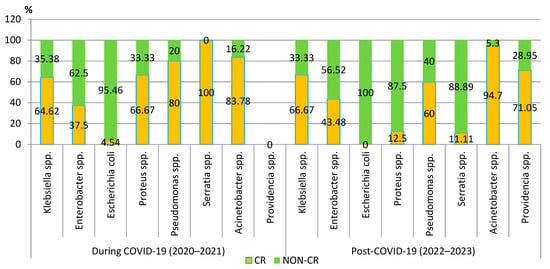 The percentage of CR Klebsiella spp., Acinetobacter spp., and Enterobacter spp. strains increased in the post-COVID-19 period, but the difference was not significant. The percentage of the CR Proteus spp. strains significantly decreased (p = 0.01).