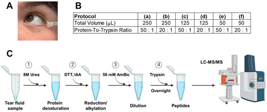 Collection and processing protocols for tear fluid samples. (A) Collection of tear fluid with glass capillary tubes is non-invasive and requires minimal training. An amount of 0.5 µL glass capillary tubes was used for all collections. (B) The protein-to-trypsin ratio and total digest volume for the six protocols evaluated in this study were as follows: (a) (50:1, 250 μL), (b) (20:1, 250 μL), (c) (50:1, 125 μL), (d) (20:1, 125 μL), (e) (50:1, 50 μL), and (f) (20:1, 50 μL). Five runs were performed for each protocol, with each run consisting of processing a single 1 μL aliquot of the pooled sample. (C) Experimental procedures for protein denaturation, reduction, alkylation, and trypsin digestion. Protocols tested differed in steps 3 and 4 as shown. In step 3, the total digestion volume was varied. In step 4, the protein: trypsin ratio was modified. The glass capillary with the 0.5 μL tear sample was transferred into a Protein LoBind microcentrifuge tube, where the entire procedure was carried out to minimize sample loss and reduce errors associated with handling small volumes. Low-speed centrifugation was used to extract the tear sample from the capillary tubes without breaking.