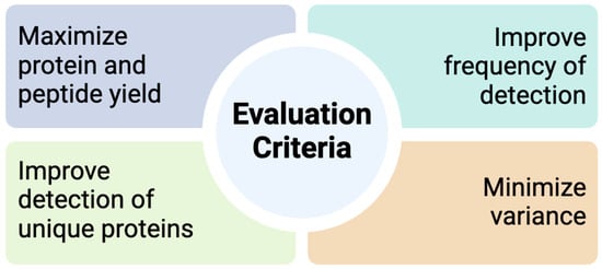 Evaluation criteria for method optimization and selection. The goals of method optimization are to maximize protein and peptide yield, improve the detection of unique proteins, improve the frequency of detection for proteins, and minimize variance.