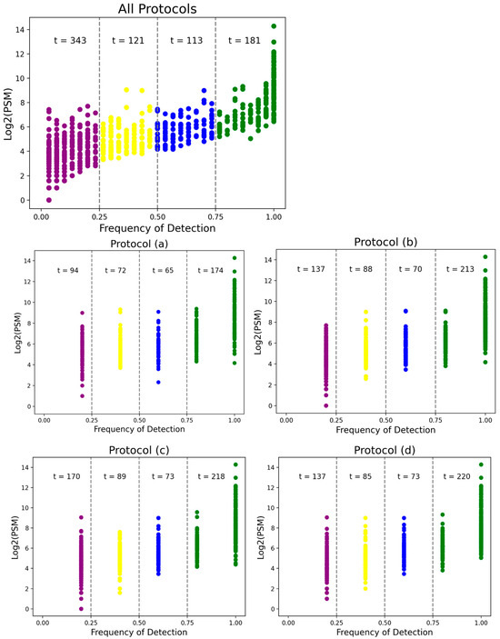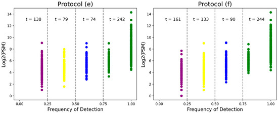 The frequency of proteins identified across processing runs plotted against abundance, as indicated by log2(PSM). Total protein identifications, as well as the frequency of identification of proteins, varied between protocol groups. Protocol (f) demonstrated the highest number of proteins detected across all frequency categories. Most notably, it detected the greatest number of proteins with high frequency (>75%). Note: PSM, peptide–spectrum matches.
