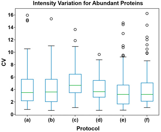 Comparison of CV% for high abundance proteins between protocols. Protocol (c) demonstrated the highest run-to-run variance, significantly higher than those observed for protocols (b), (d), (e), and (f). No other significant differences in variance were observed.