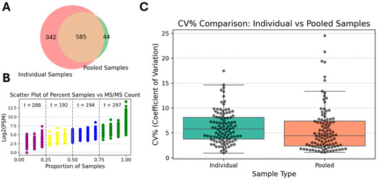 Comparison of proteins identified in individual small-volume tear fluid samples versus pooled samples run using protocol (f). (A) Individual sample runs identified 342 more proteins that were not detected in the pooled samples processed using the same processing protocol. (B) Across the individual sample runs 297 proteins were identified with high frequency (>75%), which is at the same level as the number of high-frequency proteins identified in the pooled sample. (C) The run-to-run variance was similar between the pooled and individual sample processing runs.