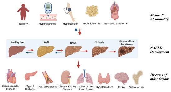 Non-alcoholic fatty liver disease (NAFLD) as an important driving force of multisystemic disorders. NAFLD is a critical contributor to multisystemic disorders. It progresses from simple steatosis (NAFL) to non-alcoholic steatohepatitis (NASH), cirrhosis, and hepatocellular carcinoma, significantly impacting liver health. Metabolic abnormalities such as obesity, hyperglycemia, hypertension, and hyperlipidemia closely interact with NAFLD. Additionally, NAFLD is linked to systemic complications, including cardiovascular disease, type 2 diabetes, chronic kidney disease, obstructive sleep apnea, and osteoporosis, emphasizing its role as a multifaceted metabolic condition. (Created in https://BioRender.com).