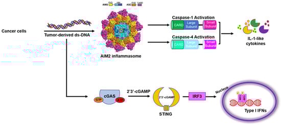 The detection of pathogen- or danger-associated molecular patterns (PAMPs or DAMPs) by host cells is a key strategy adopted by the innate immune system to guarantee physiological homeostasis. In this scenario, a pivotal role is played by pattern recognition receptors (PRRs) which are mainly expressed by immune cells and are able to trigger inflammatory events in response to endogenous (i.e., adenosine triphosphate (ATP), monosodium urate (MSU), cholesterol crystals, and β amyloid protein) and exogenous (i.e., pathogens like bacteria, fungi and viruses, asbestos, particulate matter, and UV radiation) insults. An alteration in PAMP and DAMP recognition/detection could contribute to the establishment of inflammatory/autoimmune diseases or tumorigenesis [1]. Among the intracellular DAMPs, endocytosed DNA derived from dying cells or damaged tissues, as well as self-DNA leaking from either mitochondria or nuclei, can activate an innate immune response that allows the humoral and cell-mediated adaptive immunity to exert its activity in the inflamed tissue [2]. In recent years, several immunological and oncological studies have focused on the role of genomic instability and/or the leakage of DNA as a key step for malignant transformation [1,3]. Particularly, self-DNA and cytoplasmic double-stranded DNA (dsDNA) released by cancer cells, byproducts of genomic instability, were reported to trigger the cytosolic absent in melanoma 2 (AIM2) (Figure 1) promoting tumor growth [4].