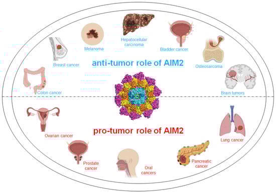 Role of AIM2 in distinct cancer types. AIM2 acts as a double-edged sword controlling cancer establishment and progression according to the biological diversity between different tumor types and the complex nature of cancer growth. Several pieces of evidence suggest that AIM2 plays an anti-tumor role in colon and breast cancer, melanoma, hepatocellular carcinoma, bladder cancer, osteosarcoma, and brain tumors. In contrast, AIM2 promotes the establishment and progression of ovarian and prostate cancer, oral malignancies, pancreatic and lung cancer.