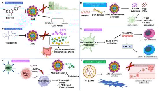 Schematic diagram of the therapeutic strategies targeting the AIM2 inflammasome in cancer. (A) The natural flavonoid luteolin exerts an anti-tumoral activity by blocking the AIM2 inflammasome activation leading to the G2/M phase arrest of the cell cycle and the inhibition of the epithelial to mesenchymal transition (EMT). (B) The AIM2 inflammasome inhibition by means of Thalidomide induces a lower release of Fibroblast growth factor 2 (FGF2) and IL-1β and IL-6, reducing the tumor growth associated with reduced pro-inflammatory cytokines ameliorating the intestinal side effects associated with irinotecan treatment in cancer patients. (C) Chimeric antigen receptor T (CAR-T) treatment induced AIM2 inflammasome activation in macrophages with the ensuing release of IL-1β and macrophages phenotypic switch, which highly expressed programmed cell death ligand 1 (PD-L1) and indoleamine 2,3-dioxygenase (IDO). (D) Tumor treating fields (TTFields) led to AIM2 triggering, favoring the activation of adaptive immunity via IL-1-like cytokines and a type I IFNs release leading to DC activation and favoring T cell activation and clonal expansion. (E) The vaccination with AIM2-deficient DCs promotes the activation of the cGAS-STING pathway, which is responsible for the release of type I IFN secretion which favors the infiltration of CD8+ T cells through the production of CXCL10 and reduces the recruitment of regulatory T cells (T regs). (F) The use of nanoparticle drug carriers for plasmid delivery, the Folate-grafted PEI600-CyD (H1)-based plasmid AIM2 (pAIM2) nanoparticles, is able to augment the expression of AIM2, to trigger cells apoptosis, and to limit cancer cell migration and invasion.