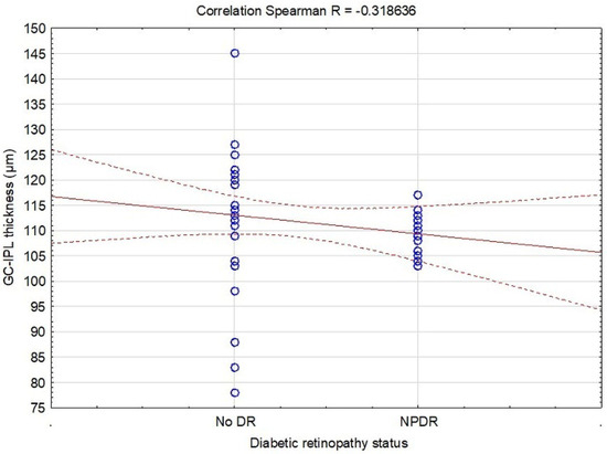 Correlations between diabetic retinopathy and the ganglion cell-inner plexiform layer thickness in patients with type 2 diabetes included in the study. Dotted lines, regression bands and 0.95 confidence interval; line, fitting type; circles, case values.