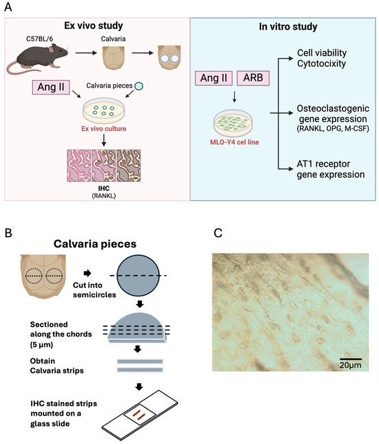 Methodology of this study. (A) Schematic representation of the ex vivo and in vitro studies. For the ex vivo study, calvariae excised from wild-type mice were excluded from the mesenchymal suture using a biopsy punch and then cut into semicircles. The calvariae pieces were cultured in a medium containing angiotensin II (Ang II) for 1 and 3 days, followed by fixation, decalcification, embedding, and sectioning. The sections were analyzed via immunohistochemistry (IHC) to examine receptor activator of nuclear factor κB ligand (RANKL) expression. ARB: Ang II type 1 receptor blocker, in this study we used azilsartan. The schematic was created with BioRender. (B) Calvariae were cut into semicircles and sectioned along the chords to observe osteocytes within the lacunae. (C) Lacunae observed using a light microscope during ex vivo culture. Scale bar = 20 μm.