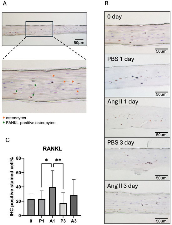 The calvariae semicircles were randomly divided into the control group (0 days) and experimental groups (1 day and 3 days), with 3 pieces per group, and cultured in 24-well plates at 37 °C in a 5% CO2 humidified incubator. Minimum essential medium α (α-MEM) supplemented with 10% fetal bovine serum (FBS), 100 U/mL penicillin, and 100 μg/mL streptomycin (Wako, Osaka, Japan) was used, with 10−⁷ M Ang II or PBS. At 0 (without treatment), 1, and 3 days, the calvariae were collected, fixed in 10% formalin at 4 °C, and decalcified with 14% EDTA at room temperature for 5 days. The decalcified calvariae were dehydrated, embedded in paraffin, and sectioned into 5 µm slices (Figure 1B). After deparaffinization, antigens were retrieved in 1 mM EDTA (pH 8) at 60 °C overnight. The sections were incubated in 3% H₂O₂ in water to block endogenous peroxidase activity. Following a rinse, the sections were blocked with 5% skimmed milk containing 0.5% Triton at room temperature for 1 h. The samples were then incubated with an anti-RANKL antibody (ab216484, 1:400, Abcam, Cambridge, UK) overnight at 4 °C and rinsed with a buffer. The control slides for each sample were incubated with a blocking buffer instead of the primary antibody. The VECTASTAIN Elite ABC Kit (VEC, Newark, CA, USA) was used for secondary antibody incubation and signal enhancement. The DAB substrate was applied for detection, and the nuclei were counterstained with hematoxylin. The sections were dehydrated and cleaned for observation and analysis [29,30] (Figure 1A).