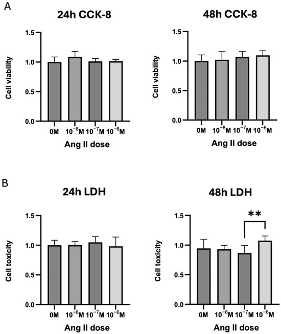 Ang II (10−⁸–10−⁶ M) did not affect MLO-Y4 cell viability (24 h and 48 h of stimulation) but showed potential cytotoxicity after 48 h of stimulation at 10−⁶ M. (A) Cell viability assessed using the CCK-8 assay. (B) Cytotoxicity evaluated using the lactate dehydrogenase (LDH) assay kit with water-soluble tetrazolium dye (WST) on culture supernatants. Non-significant data are not labeled. Tukey’s test was used to determine statistical significance between groups (n = 4; ** p < 0.01).