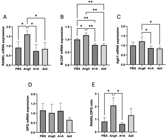 Ang II (10−⁷ M) increased the expression of osteoclastogenic genes and Ang II type 1 receptor (AT1R) mRNA levels, while AT1R blockade by azilsartan abolished these effects. (A) RANKL mRNA levels. (B) Macrophage colony-stimulating factor (M-CSF) mRNA levels. (C) AT1R mRNA levels. (D) Osteoprotegerin (OPG) mRNA levels. (E) RANKL/OPG mRNA ratio. A + A refers to the double administration of Ang II and azilsartan. Non-significant data are not labeled. Tukey’s test was used to determine statistical significance between groups (n = 4; * p < 0.05 and ** p < 0.01).