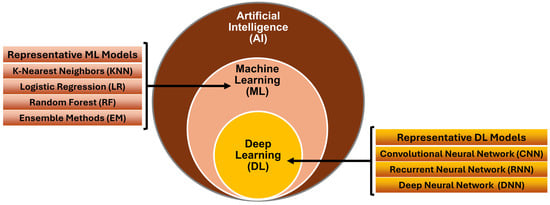 Relationships between artificial intelligence (AI), machine learning (ML), and deep learning (DL). Commonly used ML and DL models are listed, respectively.