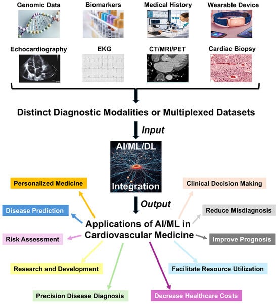 Currently, the applications of AI and ML technologies are being advanced with the integration of large-scale patient databases, medical expert inputs, and prospective validation processes in the abovementioned diagnostic modalities. For example, by analyzing high-dimensional cardiovascular data from various sources such as EKGs, echocardiograms, and other imaging modalities, AI has enabled the early detection of cardiovascular disease and the assessment of future risks [48]. The FDA approval of AI/ML-enabled medical devices underscores the growing integration of these computational breakthroughs into healthcare systems [49]. In the future, AI/ML can not only enhance clinical decision making but also pave a new way for implementing preemptive population health management and early intervention in public health and clinical practice, respectively, ultimately reducing the prevalence of cardiovascular disease and improving the prognosis and quality of life of the patients. As AI/ML continues to evolve, its integration into cardiovascular medicine promises to redefine the standards of modern medicine, ushering in a new era of precision medicine and proactive healthcare management.