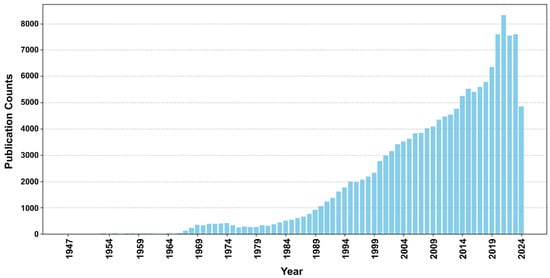 Cumulative AI publications related to cardiovascular disease. This graph shows the cumulative numbers of AI papers on cardiovascular disease in PubMed from 1947 to 2024.