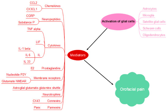 Glial cell activation and immunomodulation of orofacial pain through various mediators, including chemokines like CCL2 and CX3CL1, neuropeptides like calcitonin gene-related peptide (CGRP) and Substance P, cytokines like TNFα, neurotrophins like BDNF and NGF, leukemia inhibitory factor (LIF), interleukins (IL-1β, IL-6, IL33), receptors like nucleotide P2Y receptors and glutamate N-methyl-d-aspartate receptor (NMDAR), prostaglandins like E2, astroglial glutamate–glutamine shuttle, gap junctions connexins like CX43, and pannexins like Panx.