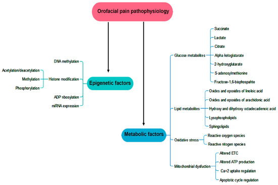 Orofacial pain pathophysiology is controlled by a multitude of factors encompassing metabolic and epigenetic elements. The metabolic factors include glucose and lipid metabolites along with reactive species regulating mitochondrial function, and the epigenetic mechanism is mainly composed of DNA methylation and histone modification.