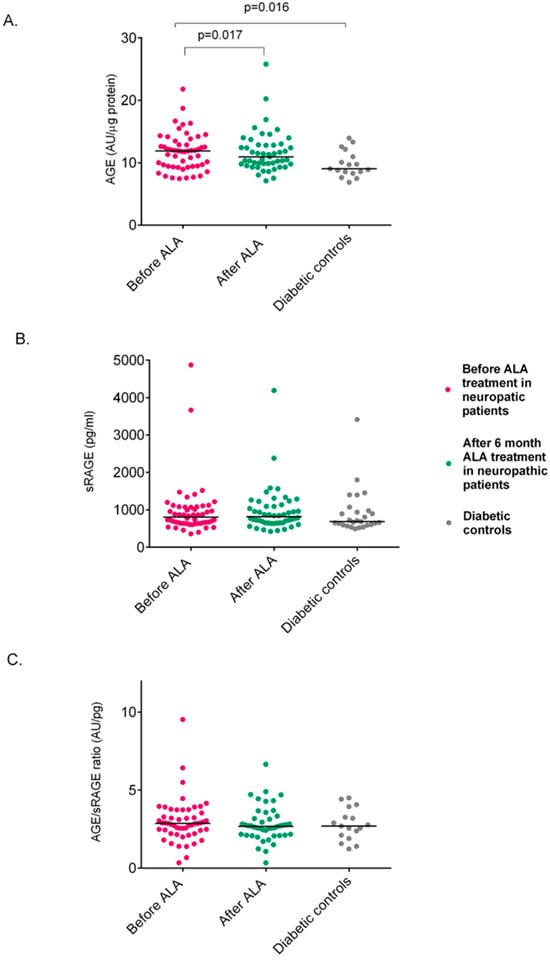 Plasma concentrations of AGEs (A), sRAGE (B), and AGE/sRAGE ratio (C) in patients with type 2 diabetes with neuropathy before and after six months of 600 mg/day alphalipoic acid (ALA) treatment and in diabetic controls without neuropathy. Solid lines represent medians. Magenta dots represent data from neuropathic patients before ALA treatment, green dots represent data from neuropathic patients after six months of ALA treatment, and grey dots represent data of age-, gender-, and BMI-matched diabetic controls. p-values were calculated by the Wilcoxon matched paired test in neuropathic patients before and after ALA, and by the Mann–Whitney U-test between neuropath patients and diabetic controls. Abbreviations: ALA, alphalipoic acid; AGE, advanced glycation end product; AU, autofluorescence; sRAGE, soluble receptor of advanced glycation end products.