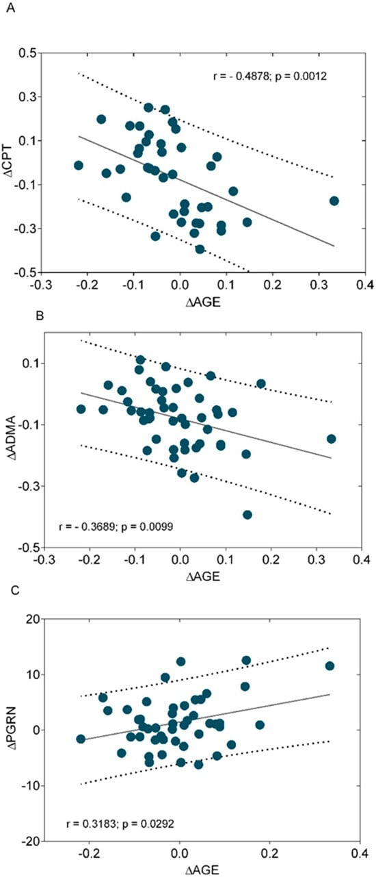 The decrease of CPT values and the change of ADMA levels were negatively correlated with the change of AGE levels (Figure 2A,B). The increase of PGRN positively correlated with the change of AGEs (Figure 2C).