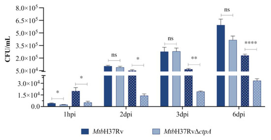 To ascertain whether, as with other P1B-type ATPases, CtpA may be involved in the intracellular survival of Mtb [20,28], the bacterial load (CFU/mL) was quantified at different post-infection times in mouse alveolar macrophages (MH-S cell line) infected with the wild-type MtbH37Rv or mutant MtbΔctpA strain at MOI 1:3 (Figure 3). Considering that CtpA is a Cu+-ATPase, it is possible that the bacterial growth could be affected by the presence of copper, which is required for the activation of CtpA [16]. To investigate this, the bacterial load was assessed with and without 50 μM CuSO4 (Figure 3).
