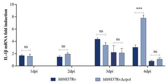 Transcription of IL-1β mRNA in Mtb-infected macrophages. The levels of IL-1β mRNA produced by MH-S cells infected with MtbH37Rv or MtbH37RvΔctpA in the absence (solid bar) or presence of 50 μM CuSO4 (dotted bar) were quantified by RT-qPCR. Relative transcription levels were calculated using the Pfaffl method concerning uninfected cells using the gapdh gene as a housekeeping gene. Presented values correspond to the mean ± SEM of triplicate of four independent experiments. Asterisks indicate a statistically significant difference with respect to the transcription induced by parental strain infection (ns p > 0.5, *** p < 0.005).